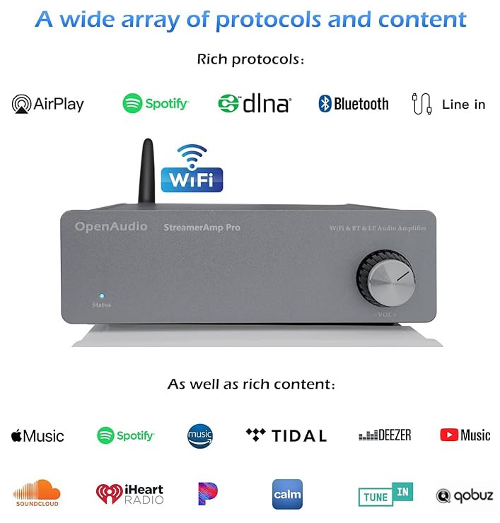 The HoloHome StreamerAmp Pro is a streaming power amplifier capable of delivering 150 W per channel at 8 ohms or 300 W per channel at 4 ohms. Like the HOLO-WHAS / Streamer+ / StreamerAmp Pro, users can choose from following WiFi Audio streaming protocols:
