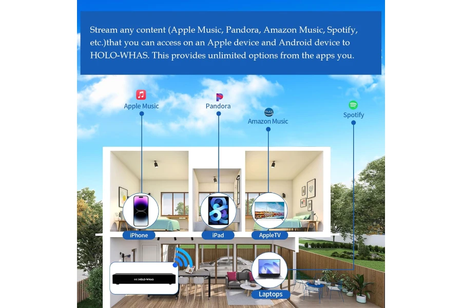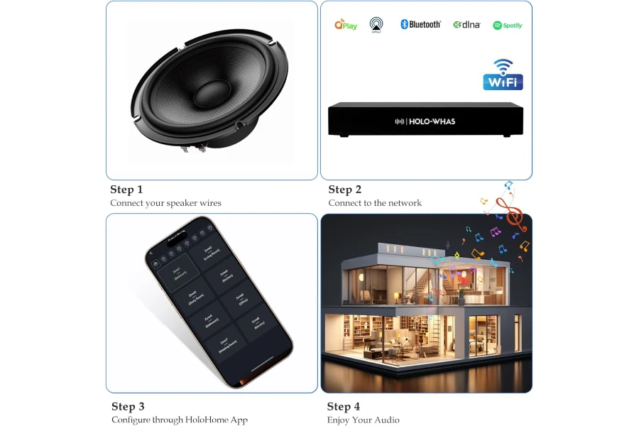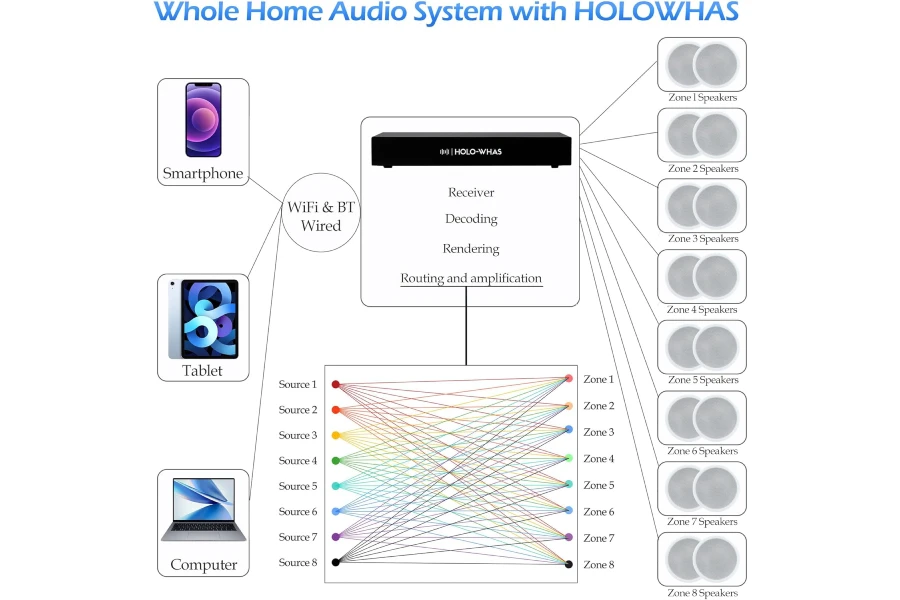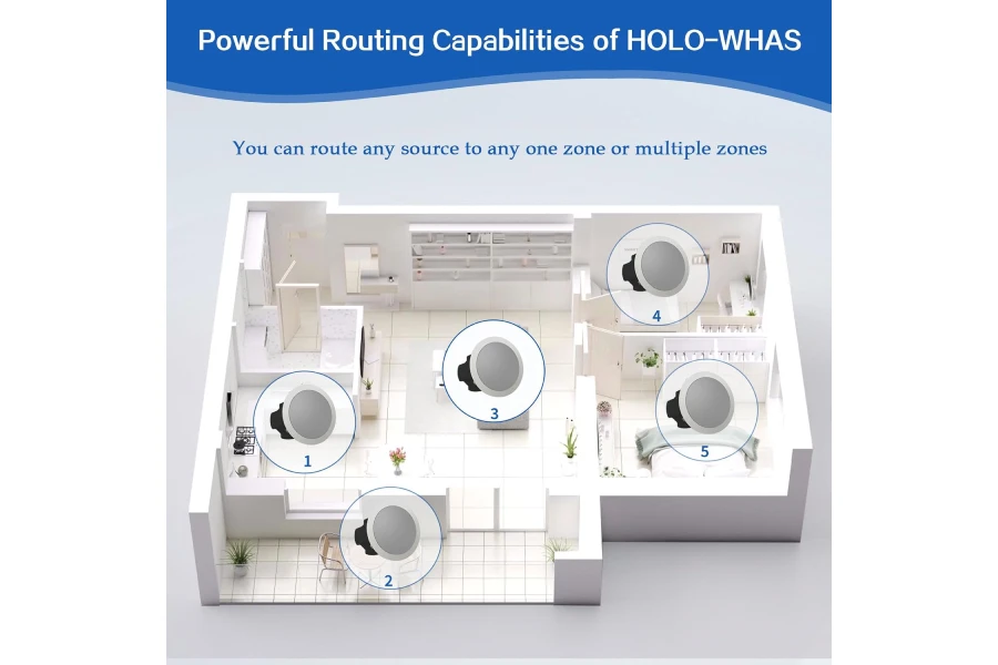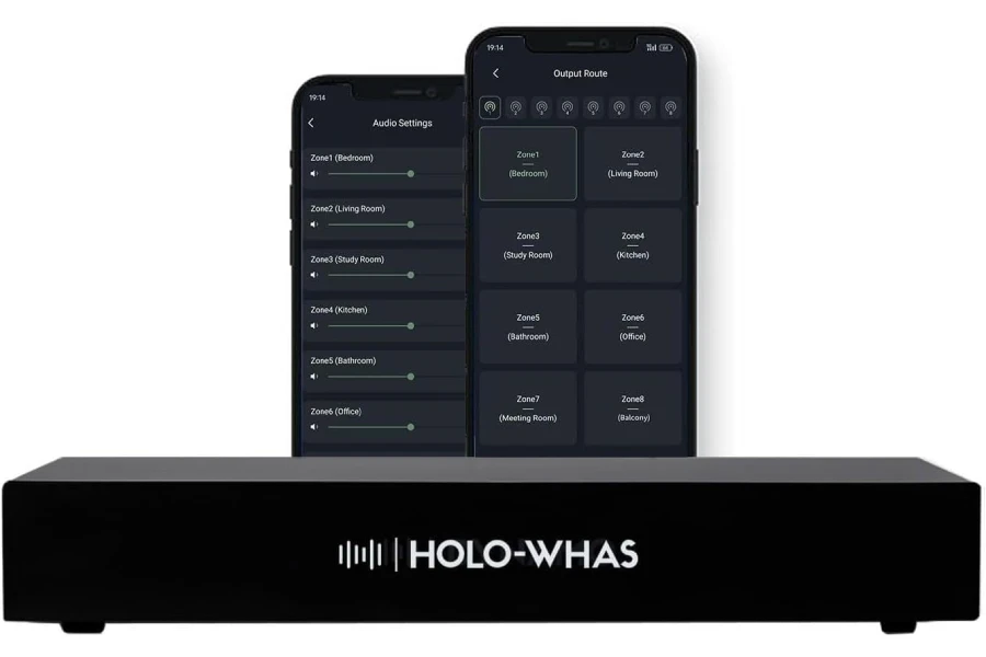 HOLOWHAS is an 8-zone multi-room streaming amplifier that boasts an impressive power output of 16 channels at 60W each, totaling a massive 960W.