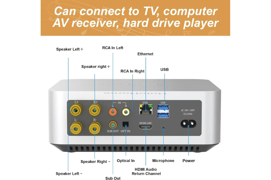 The HoloHome Streamer+ features an HDMI ARC interface for easy connection to a television. Additionally, the HoloHome Streamer+ also has an Optical digital interface, RCA analog interface and USB Disk, enhancing your audio experience in every way.