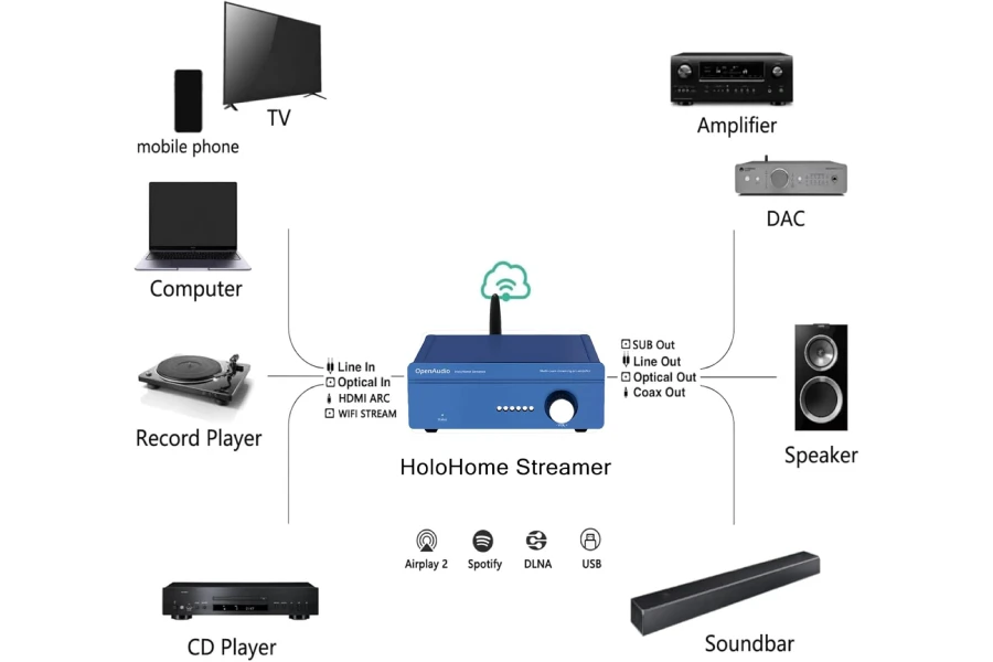 The HoloHome Streamer can be used with active speakers and amplifier; it is a versatile network music streamer. Like the HOLO-WHAS/Streamer+/StreamerAmp Pro, users can choose from following WiFi Audio streaming protocols: Qobuz Connect, Airplay2, Spotify Connect, and DLNA. The HoloHome Streamer features an HDMI ARC interface for easy connection to a television. Additionally, the HoloHome Streamer also has an Optical digital interface, RCA analog interface and USB Disk, enhancing your audio experience in every way.